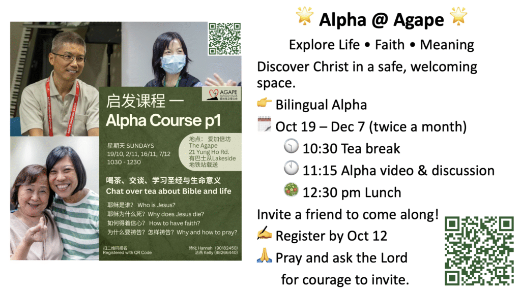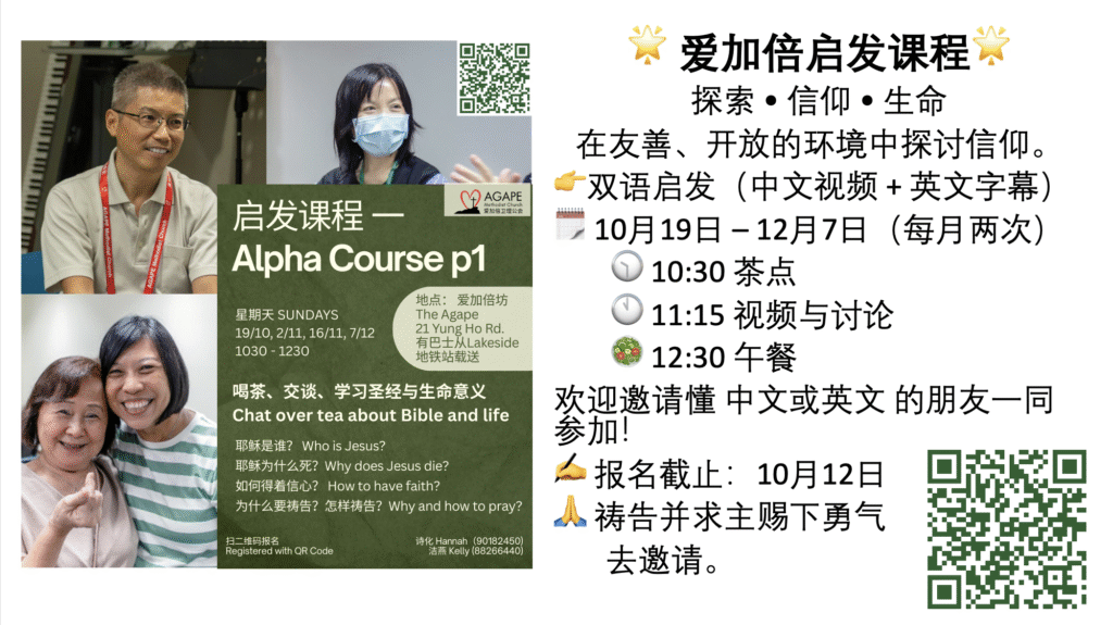 This year, we are organising a bilingual Alpha (Chinese with English subtitles), held twice a month. The first half runs from October 19 to December 7. The Chinese videos are produced in Asia, designed with an Asian context in mind. You are encouraged to invite anyone who understands either Chinese or English.